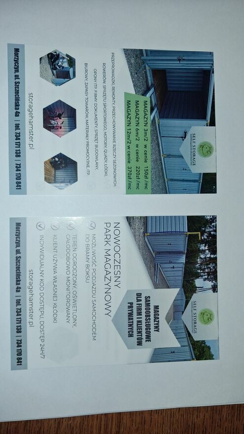 Oferta dotyczy magazynu o pow . 4,5m/3 o wymiarach w cenie 150 zł netto / mcMagazyn znajduje się na ogrodzonym i monitorowanym terenie w Morzyczynie nad jeziorem Miedwie przy ul .Szczecińskiej 4 za komisami na przeciwko sklepu NETTO . Dostęp do swojego boksu posiadasz przez 48 godzin 7 dni w tygodniu .Trzy możliwości wjazdu : bramą na pilota , wpisaniem kodu w domofonie lub na tkz " pestkę "